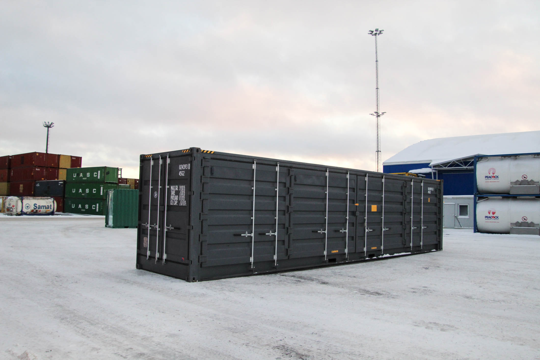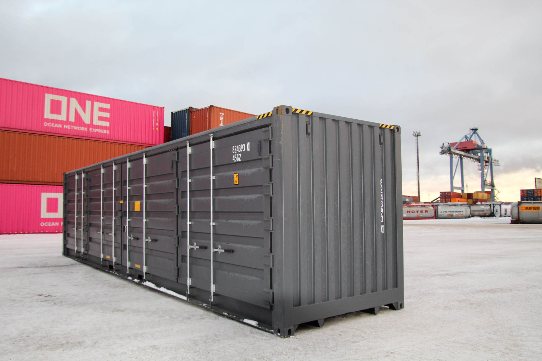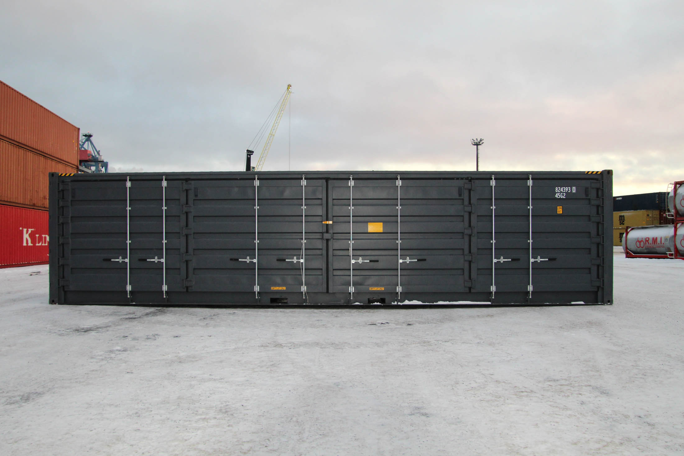 40′ (12 m) HC Open Side, i.e., a raised side-opening shipping container. One long side of the container can be opened, and there are double doors at the end. A very practical model when you need a long, easy-to-load, and quick-to-deploy space solution.