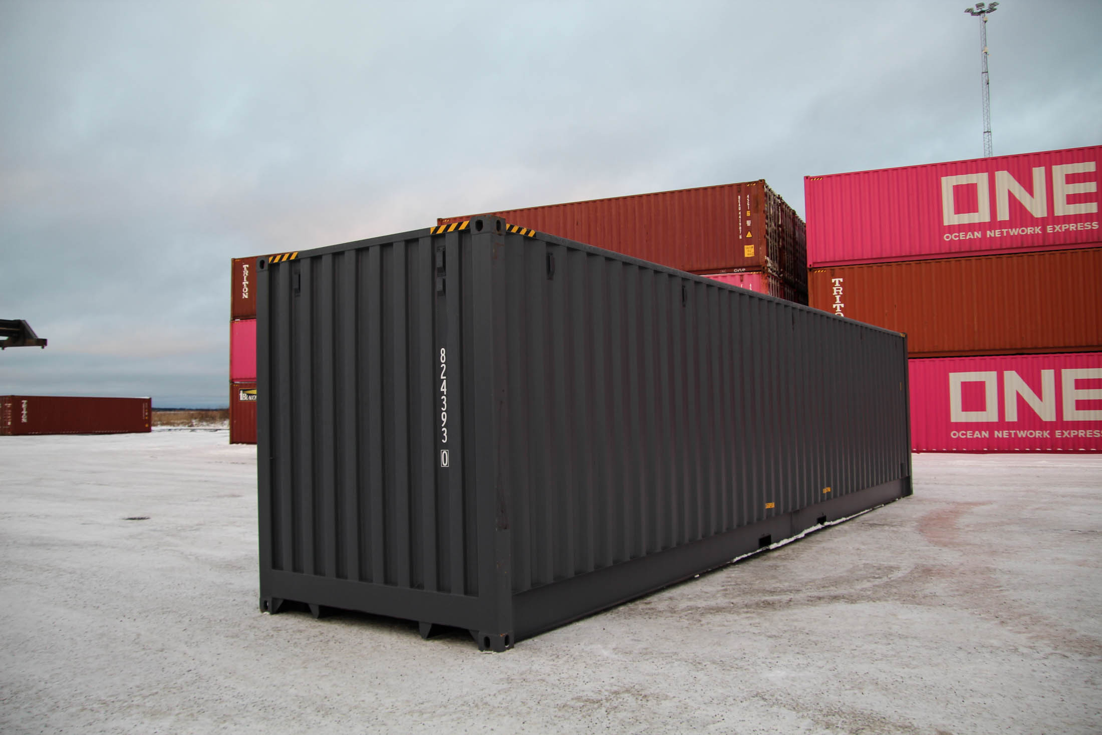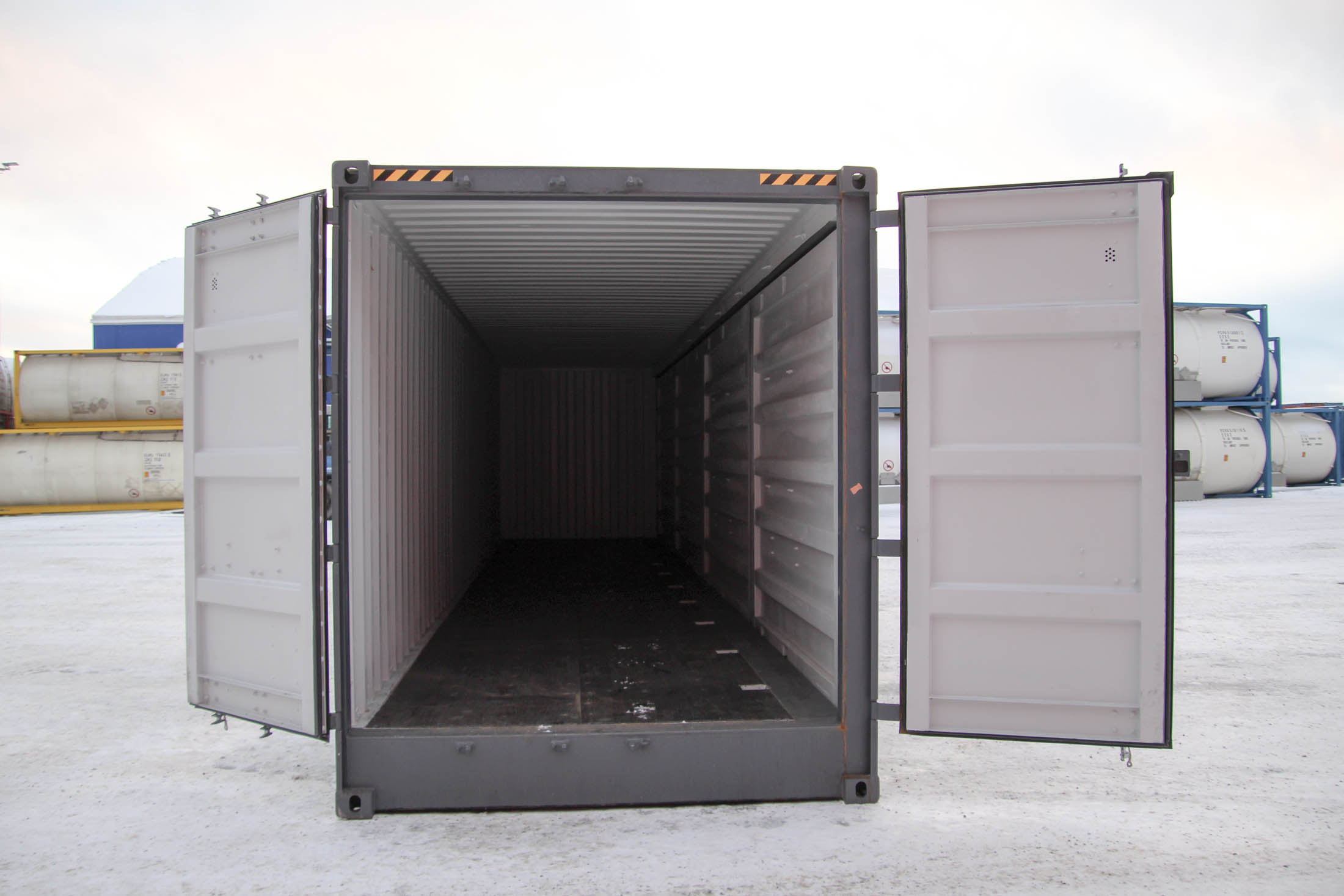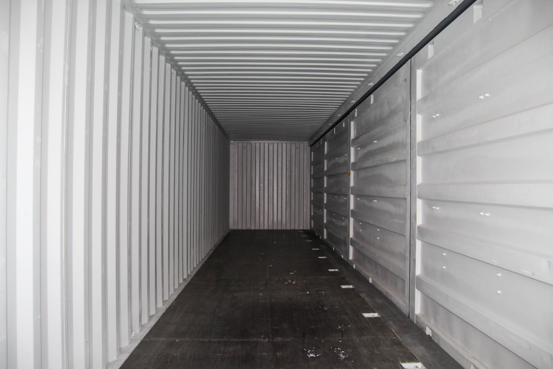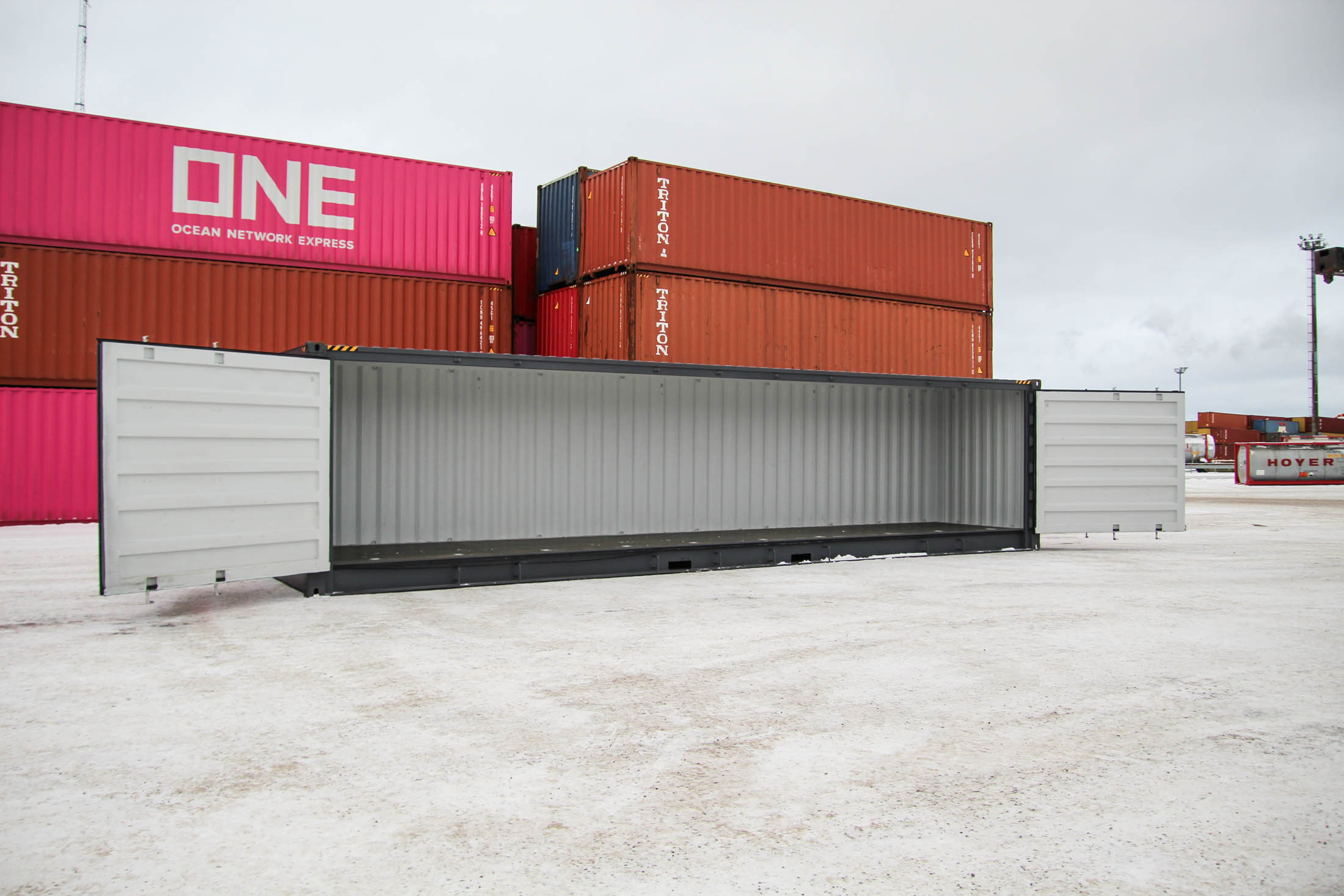 40′ (12 m) HC Open Side, i.e., a raised side-opening shipping container. One long side of the container can be opened, and there are double doors at the end. A very practical model when you need a long, easy-to-load, and quick-to-deploy space solution.